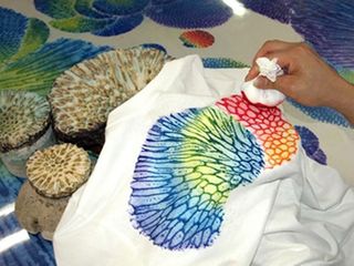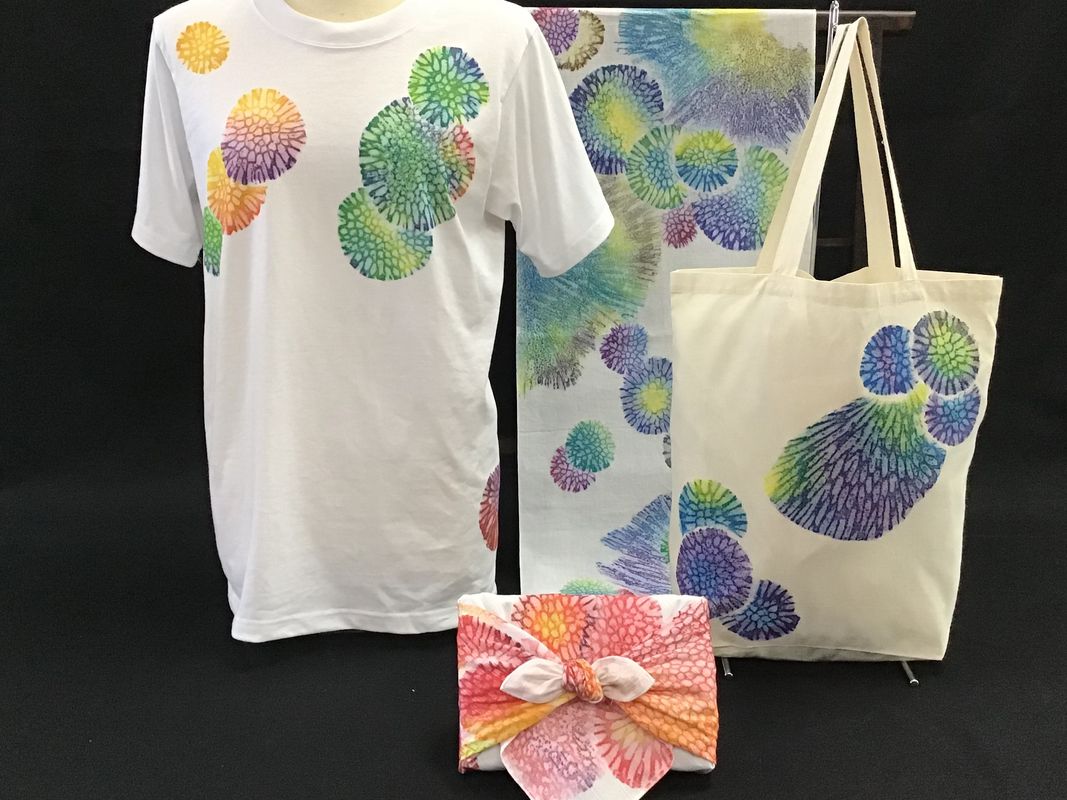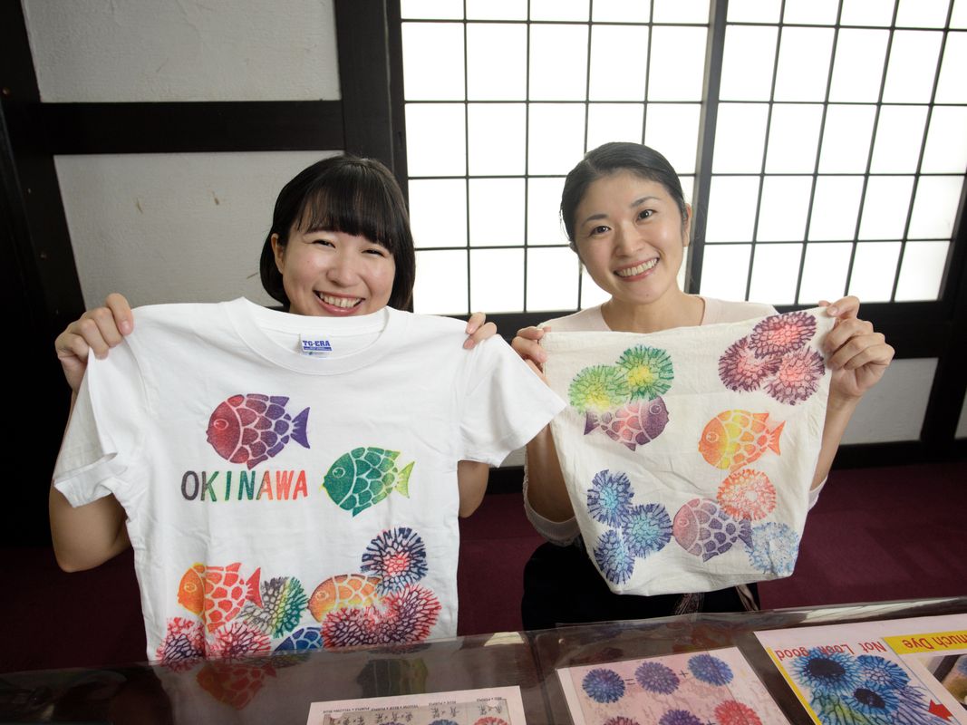 大小様々な形のサンゴからお好きなものを使ってデザインを組み合わせ、タンポと呼ばれる道具に色とりどりの染液を染み込ませて染めていきます。