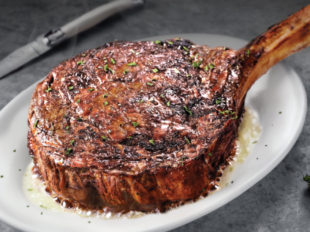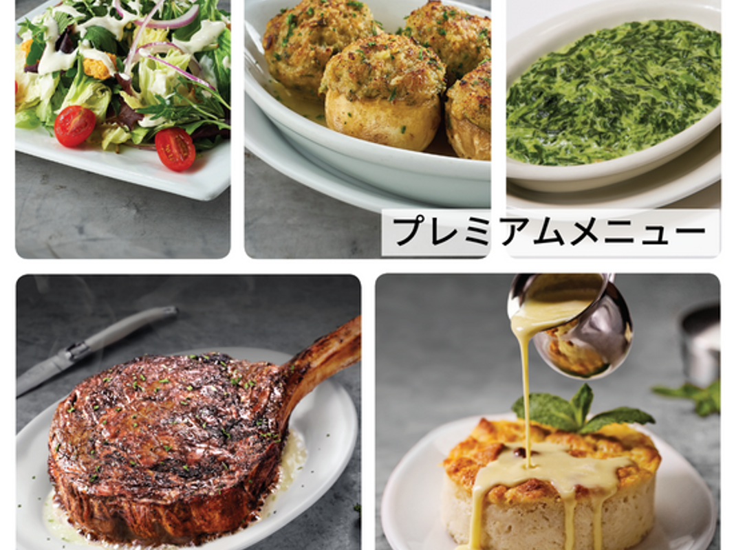 【プレミアム・トマホーク・リブアイ・ディナー(2名様から)】 ●アペタイザー(※それぞれお二人様用です。一品お選び下さい) マッシュルームのクラブミート詰め、バーベキューシュリンプ ●サラダ(※一品お選び下さい) シーザーサラダ、ステーキハウスサラダ ●アントレー(※メインディッシュ、シェアしてお召し上がりください) トマホーク・リブアイステーキ、カウボーイリブアイステーキ(3名様の場合) ※2名様で1つのトマホークをシェアして頂くメニューです。3名様(奇数)の場合、小さめトマホーク1つ、カウボーイリブアイ1つをシェアして頂きます。 ●付け合わせ(※シェアしてお召し上がりください) マッシュポテト、ライス、ほうれん草のクリーム煮 ●デザート(※一品をお選び下さい) ブレッドプディング、アイスクリーム、シャーベット ●お飲み物 コーヒー、紅茶、アイスティー