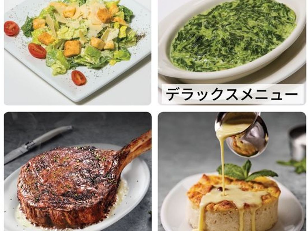 【デラックス・トマホークリブアイディナー(2名様から)】 ●サラダ ステーキハウスサラダ ●アントレー(※メインディッシュ、シェアしてお召し上がりください) トマホーク・リブアイステーキ カウボーイリブアイステーキ(※3名様の場合) ※2名様で1つのトマホークをシェアして頂くメニューです。3名様(奇数)でお申込みの場合、小さめトマホーク1つ、カウボーイリブアイ1つの計2つをシェアして頂きます。 ●付け合わせ(※シェアしてお召し上がりください) マッシュポテト、ライス、ほうれん草のクリーム煮 ●デザート(※一品お選び下さい) ブレッドプディング、アイスクリーム、シャーベット ●お飲み物 コーヒー、紅茶、アイスティー