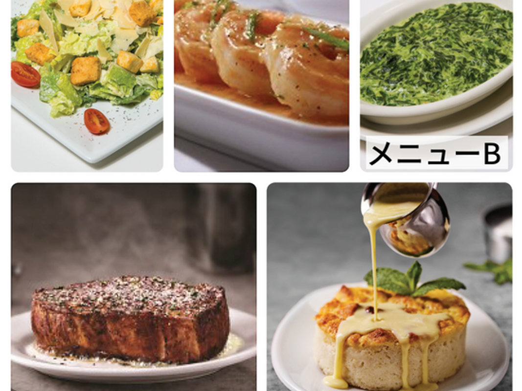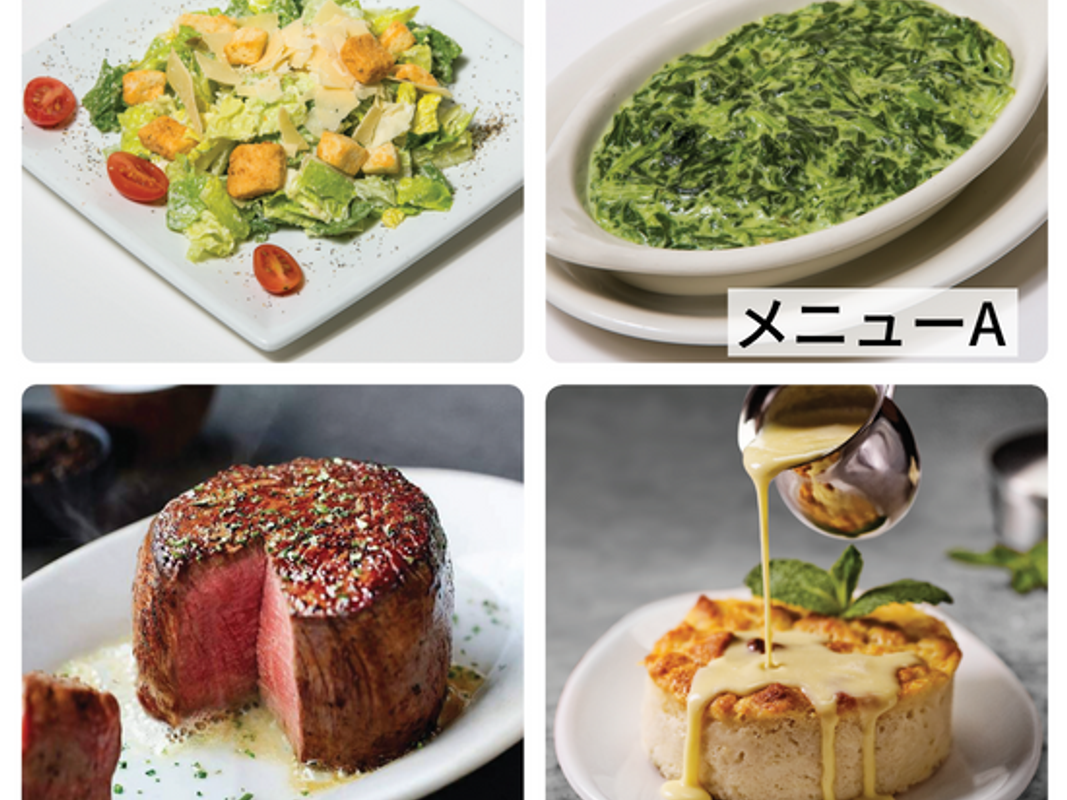 【メニューB】 ●アペタイザー(※それぞれ2名様用です。下記より一品お選び下さい) マッシュルームのクラブミート詰め、バーベキューシュリンプ、オッソブッコのラビオリ(袋状パスタ) ●スープ、またはサラダ(※一品お選び下さい) ルイジアナ・シーフード・ガンボ・スープ、ステーキハウスサラダ ●アントレー(※メインディッシュ、一品お選び下さい) フィレミニヨンステーキ、ステーキ&シュリンプ、リブアイ、ニューヨークステーキ、魚料理(本日の鮮魚料理:係りの者にお問合せください) ●付け合わせ(※一品をお選び下さい) ほうれん草のクリーム煮、マッシュポテト、ライス ●デザート(※一品をお選び下さい) ブレッドプディング、アイスクリーム、シャーベット ●お飲み物 コーヒー、紅茶、アイスティー