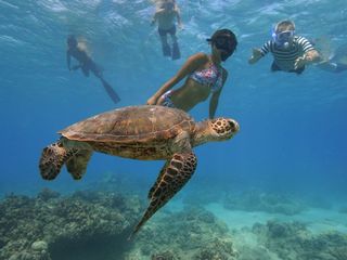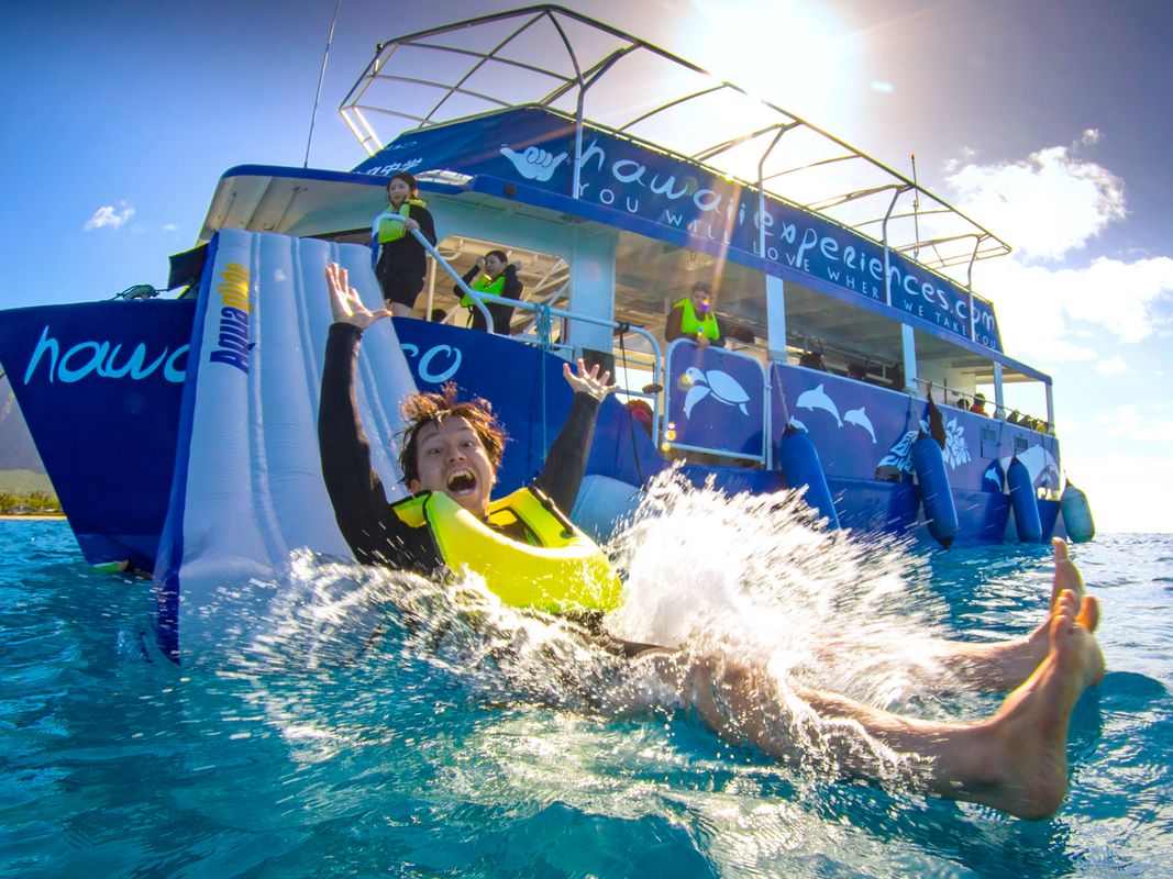 西オアフ沖でのイルカやウミガメ、熱帯魚とのシュノーケルはもちろんのこと、人気のスタンドアップパドルやウォータースライダー、ウォールクライミングもお楽しみいただけます! たくさん遊んだらお腹もペコペコ、美しい景色を見ながら嬉しいランチ付き♪