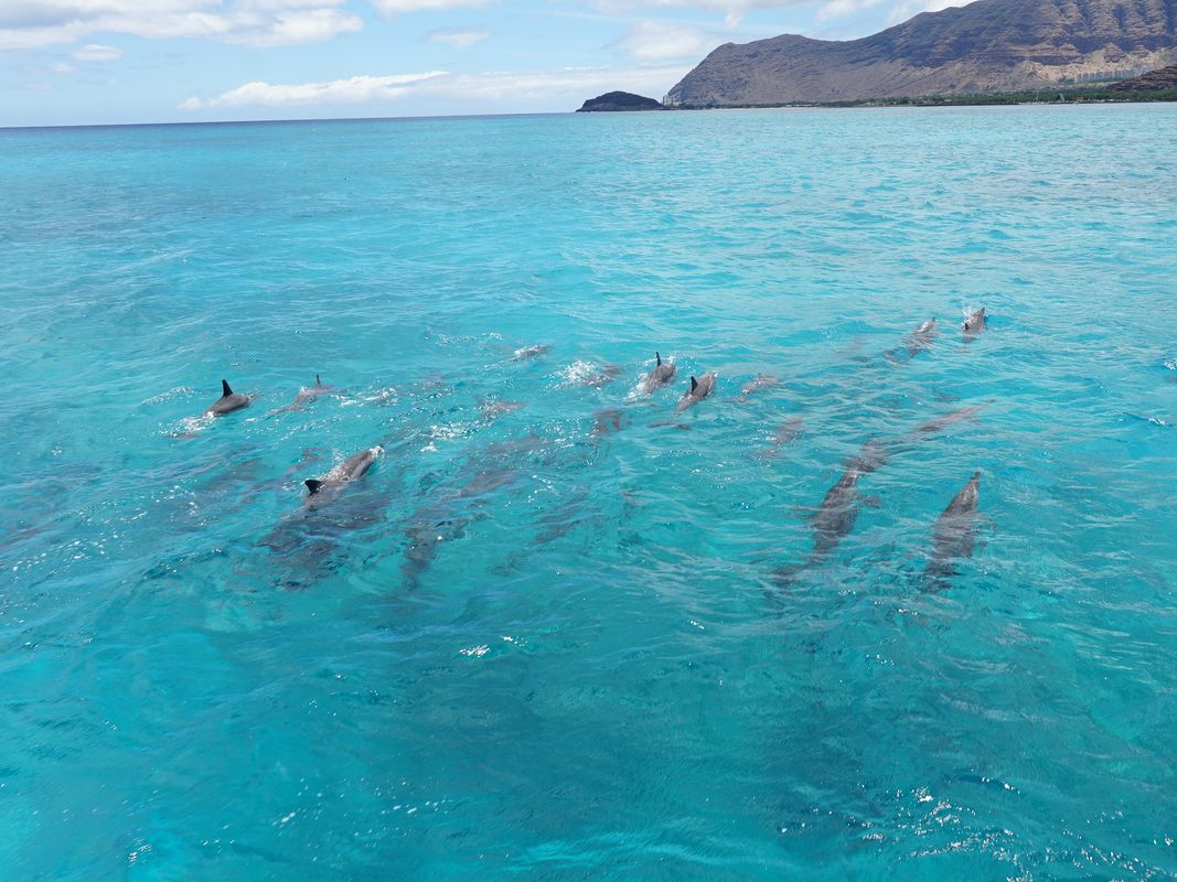 西オアフ沖でのイルカやウミガメ、熱帯魚とのシュノーケルはもちろんのこと、人気のスタンドアップパドルやウォータースライダー、ウォールクライミングもお楽しみいただけます! たくさん遊んだらお腹もペコペコ、美しい景色を見ながら嬉しいランチ付き♪ イルカを探してウエストコーストをクルーズ。(この期間ドルフィンスイムはございません)