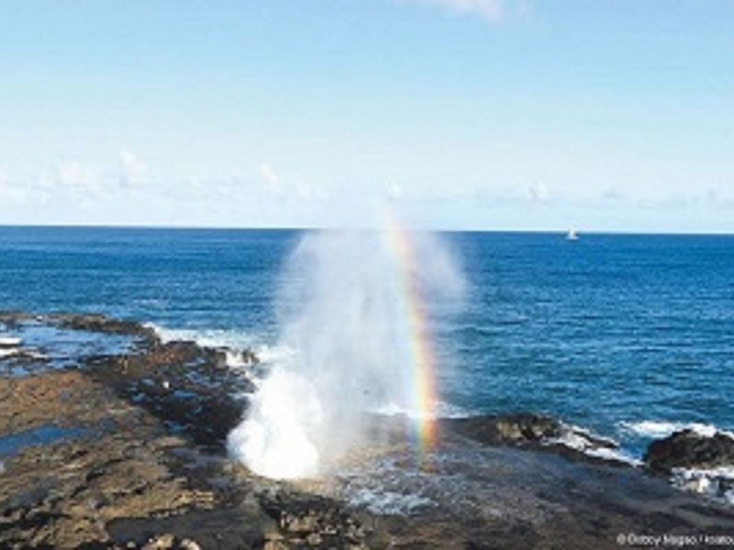 潮吹き岩は、ポイプ・エリアの西側の海岸にある一見小さな溶岩棚。この岩に空いている空洞から、波によって押し出された海水が勢いよく潮を噴き、ゴォーという轟音とともに高く吹き上がる潮は大迫力です!