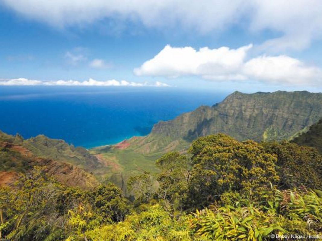 カララウ渓谷とその下の白砂のビーチのパノラマ ビューを楽しめる展望台です。